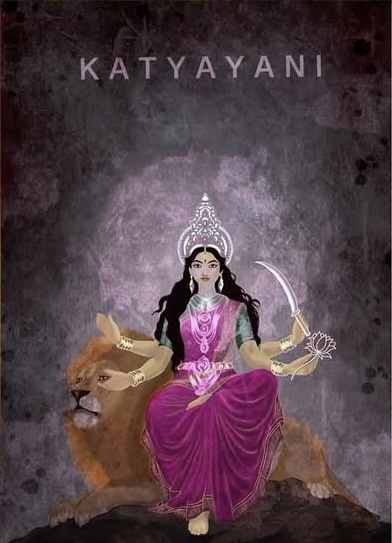 聖者カティヤーヤナの苦行によって生まれたカティヤーヤニー女神は、 輝く剣を手にライオンに乗る、光り輝く戦士です。